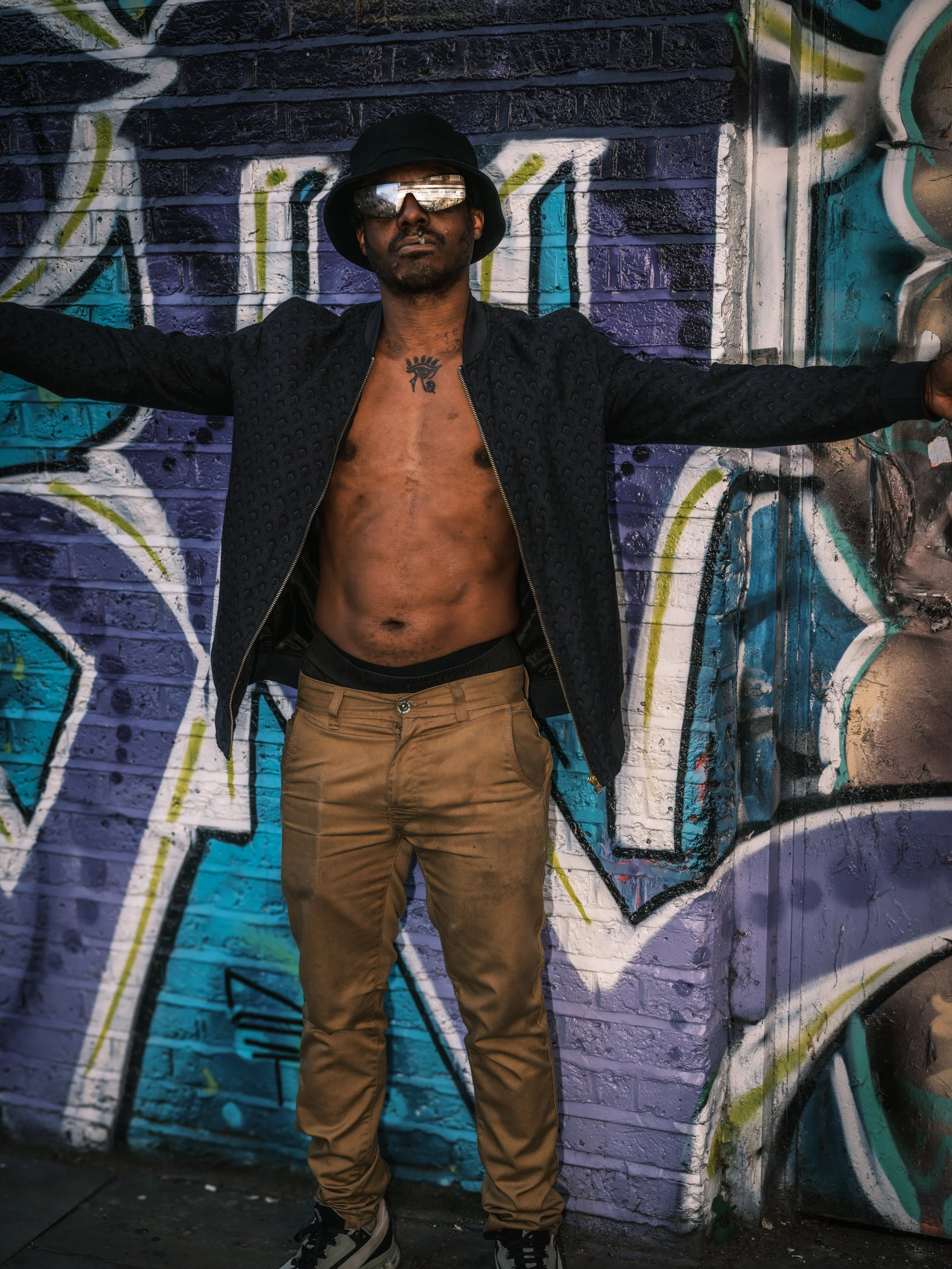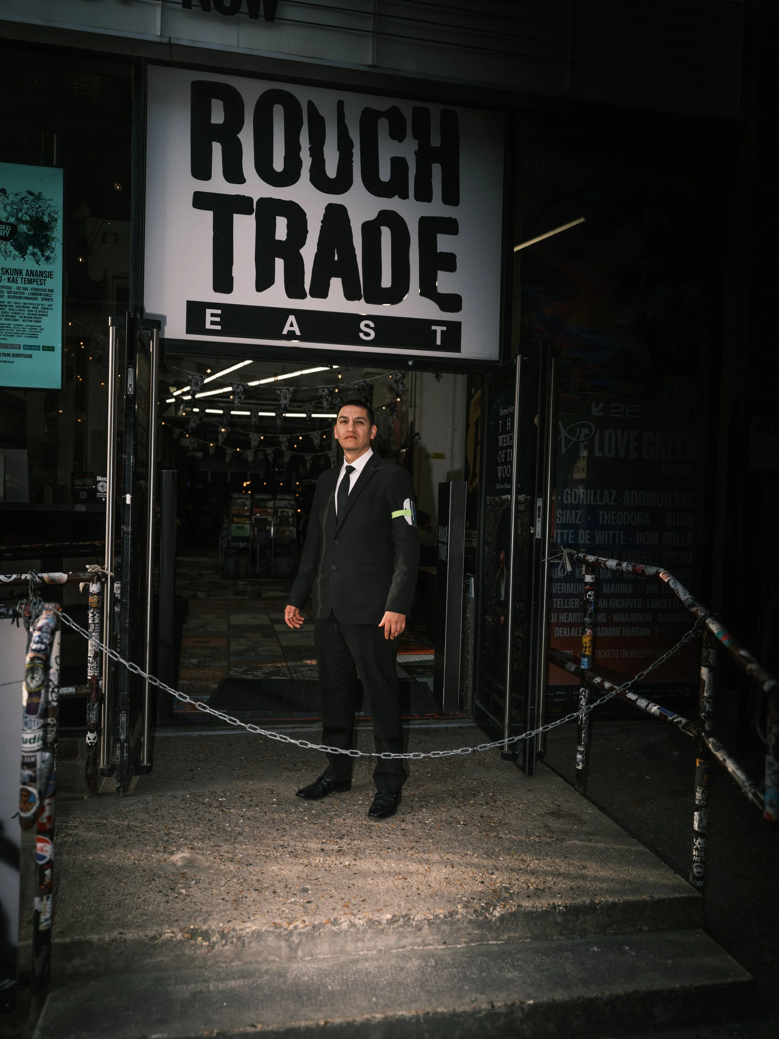 The flash does something interesting on the street. It isolates. Cuts through the chaos, lifts the subject out of the noise of Brick Lane — the graffiti, the traffic, the half-light of a warm spring evening. For a fraction of a second, it turns pavement into studio. The ordinary becomes framed, intentional, cinematic.